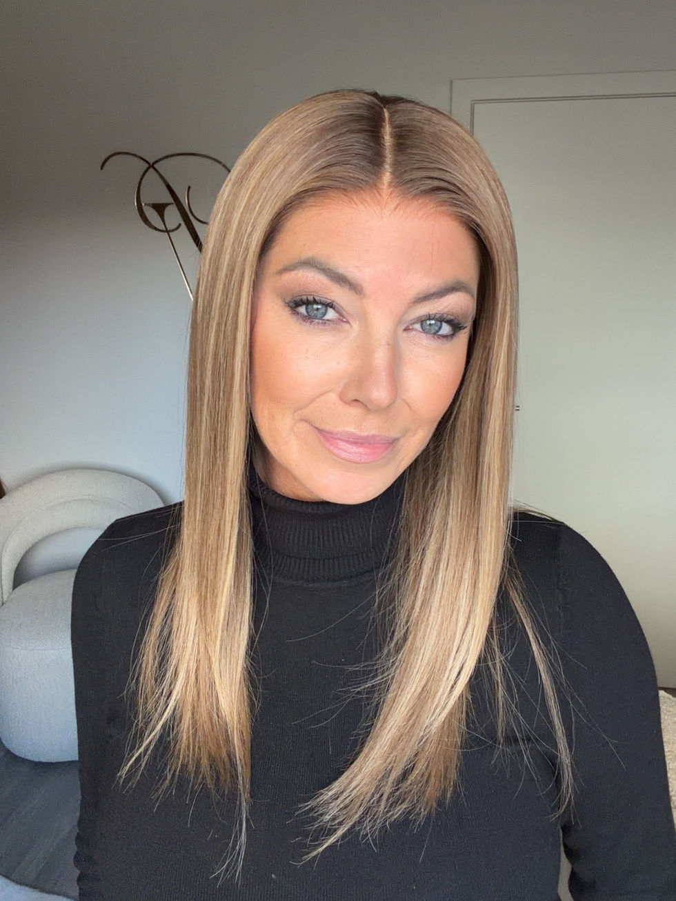 - Sandy medium blonde (level 8/7 base) with a soft root