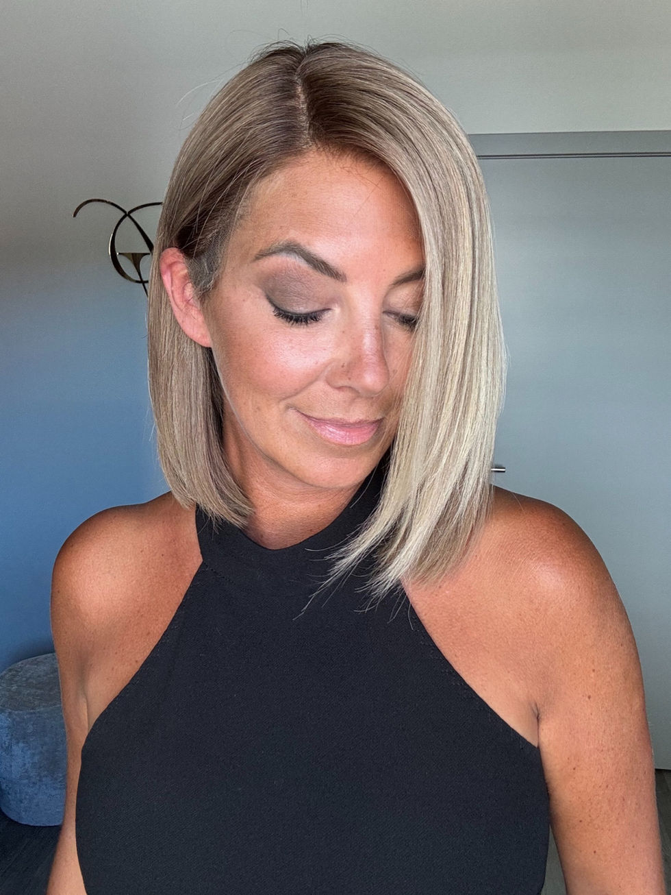 - Sandy blonde (level 8 base) with a soft level 6/7 root
