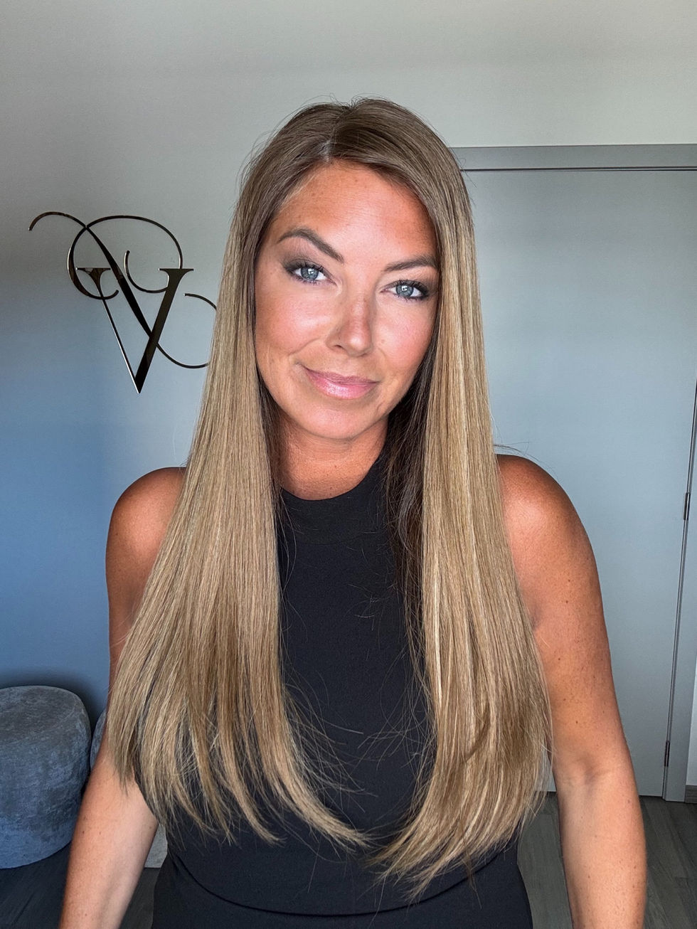 - Dark blonde balayage with a darker root (level 6 ash) added