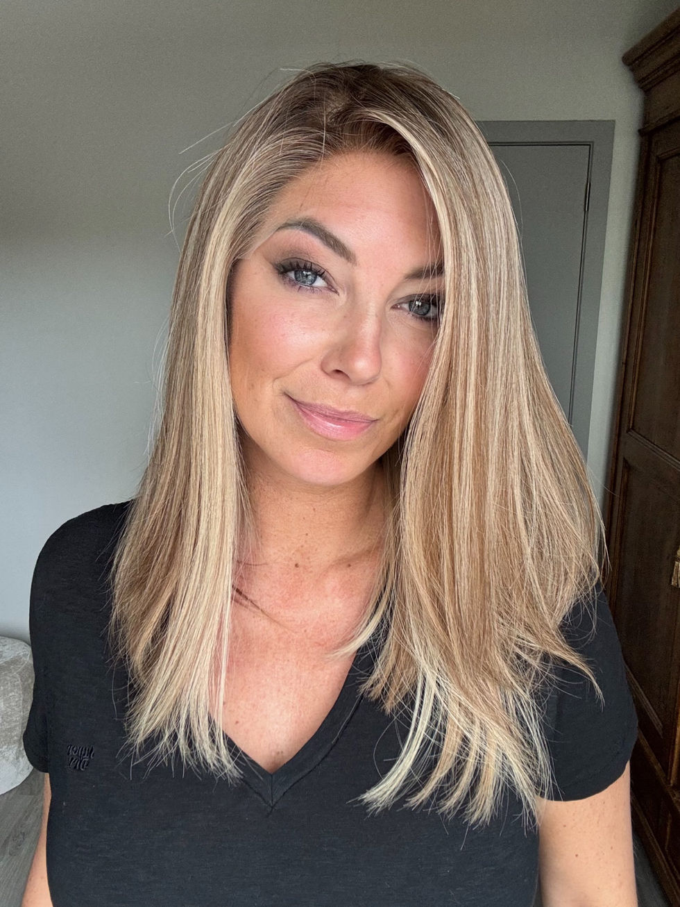 - Level 8 base balayage with level 9/10 highlights & light hair in the front (light front hair is softly rooted, can be orderded without a root as a scandi hairline)