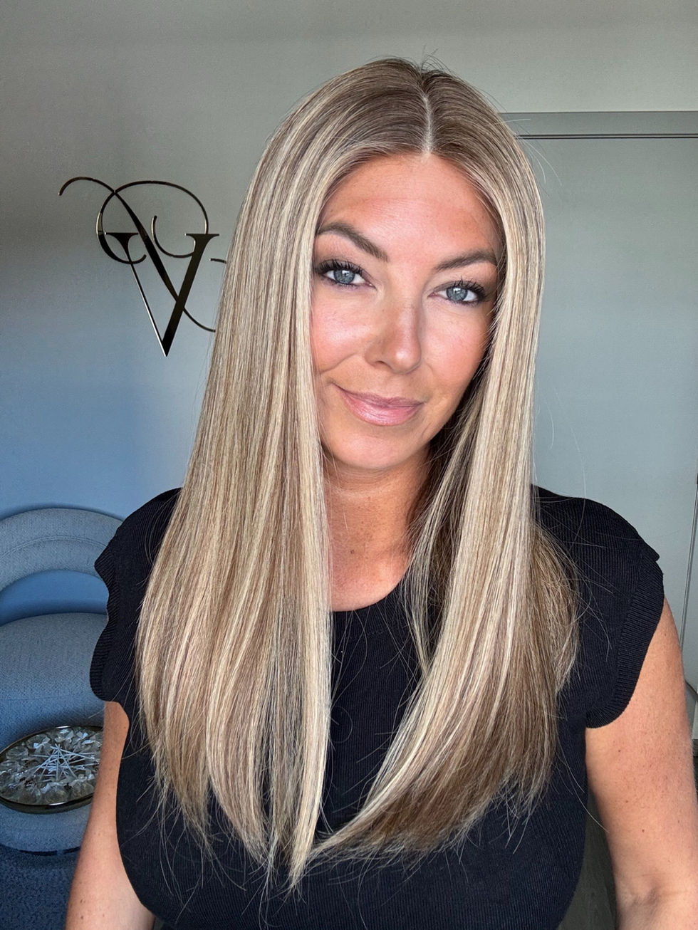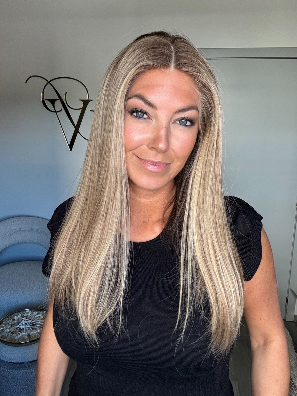 - Dimensional blonde balayage with level 9/10 highlights & light hair in the front (light front hair is softly rooted)