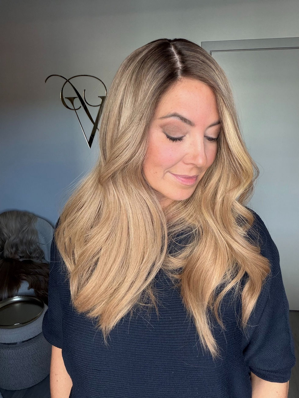 - Color: Neutral to warm toned medium blonde with a darker root blended
