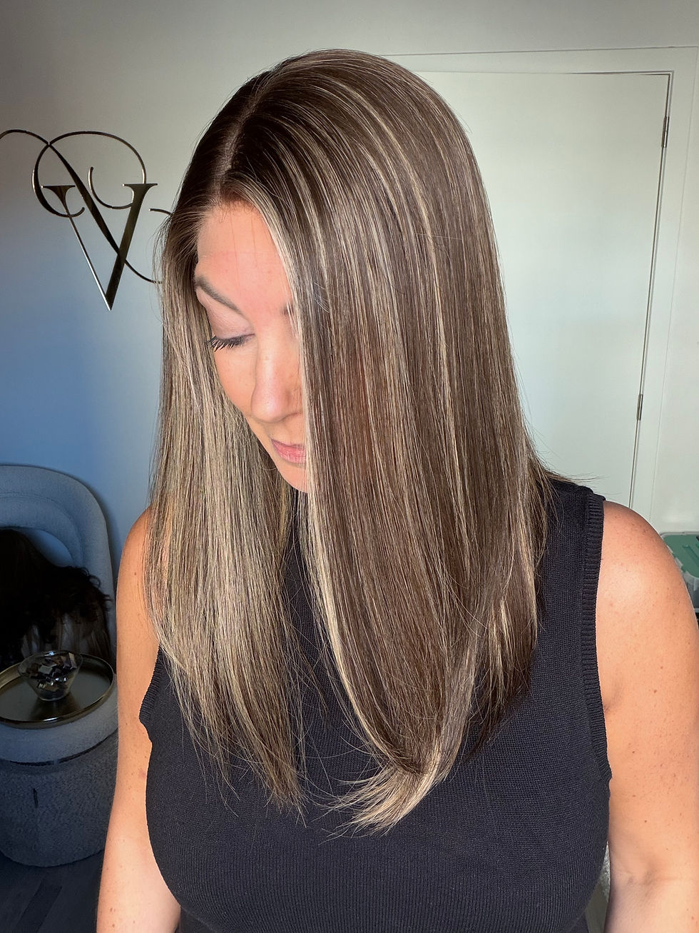 De uitgroei (root color) kan altijd aangepast worden om mooi te blenden met je eigen haar, maar ik werk enkel donkerder, nooit lichter.
