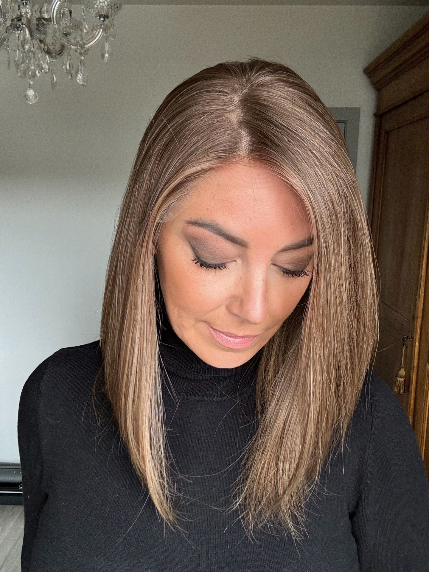 The part line can easily be concealed with a little powder if desired. Front hairline knots are kept light and hand-painted for a soft, natural look.