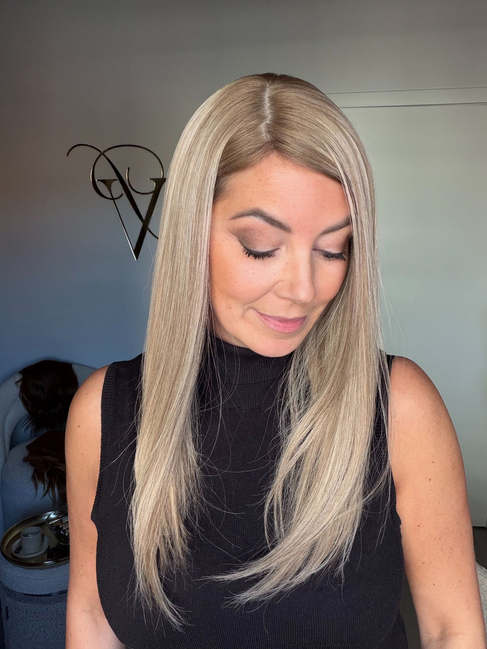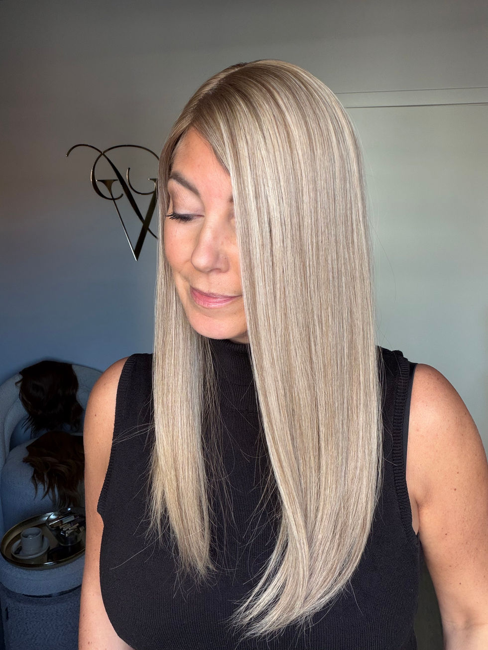 - Ashy dimensional blond with very subtle level 9/8 lowlights and a very soft light root (can be darkened)