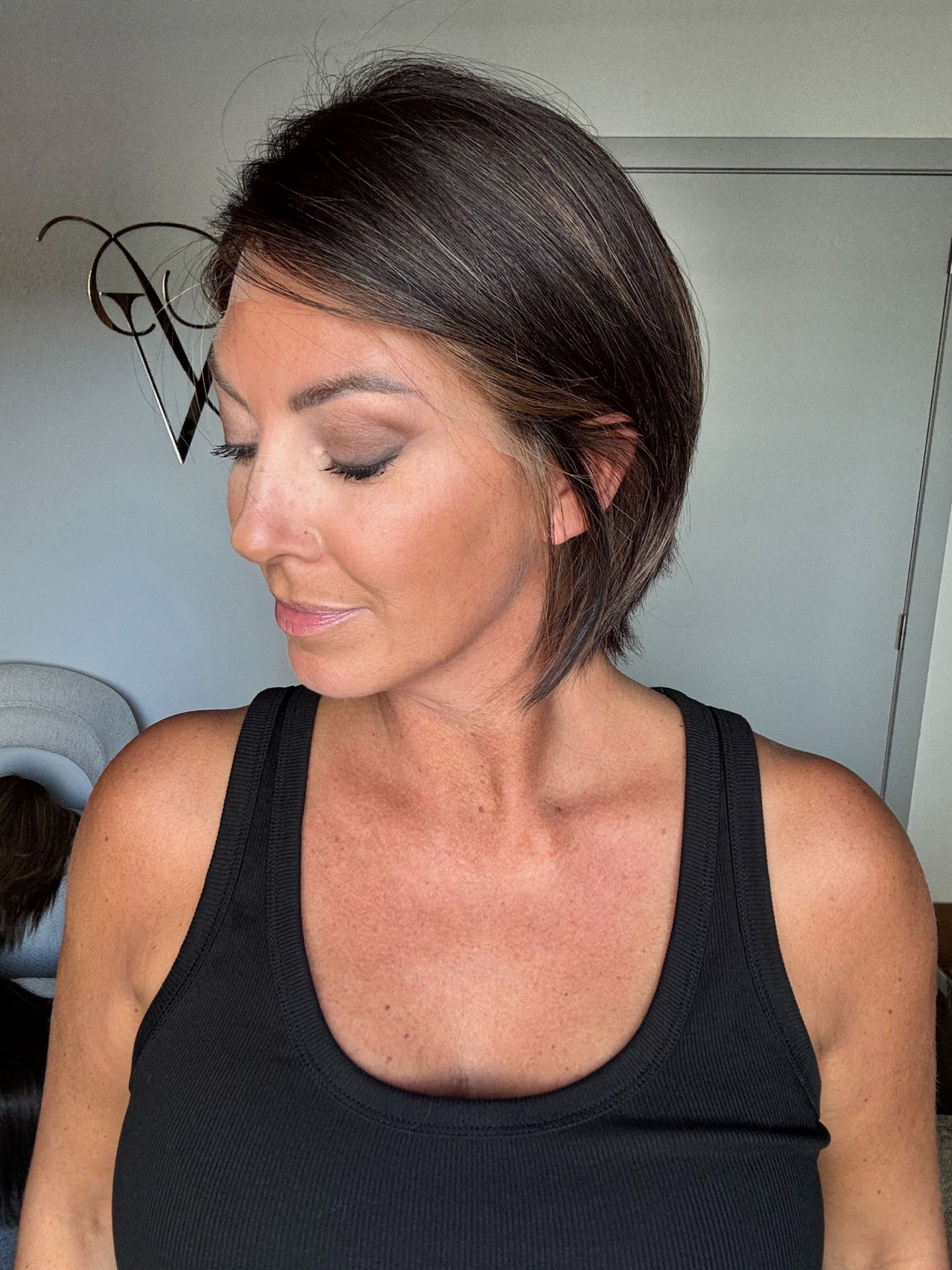 - Neutral/warm level 4 base brunette with level 6 highlights